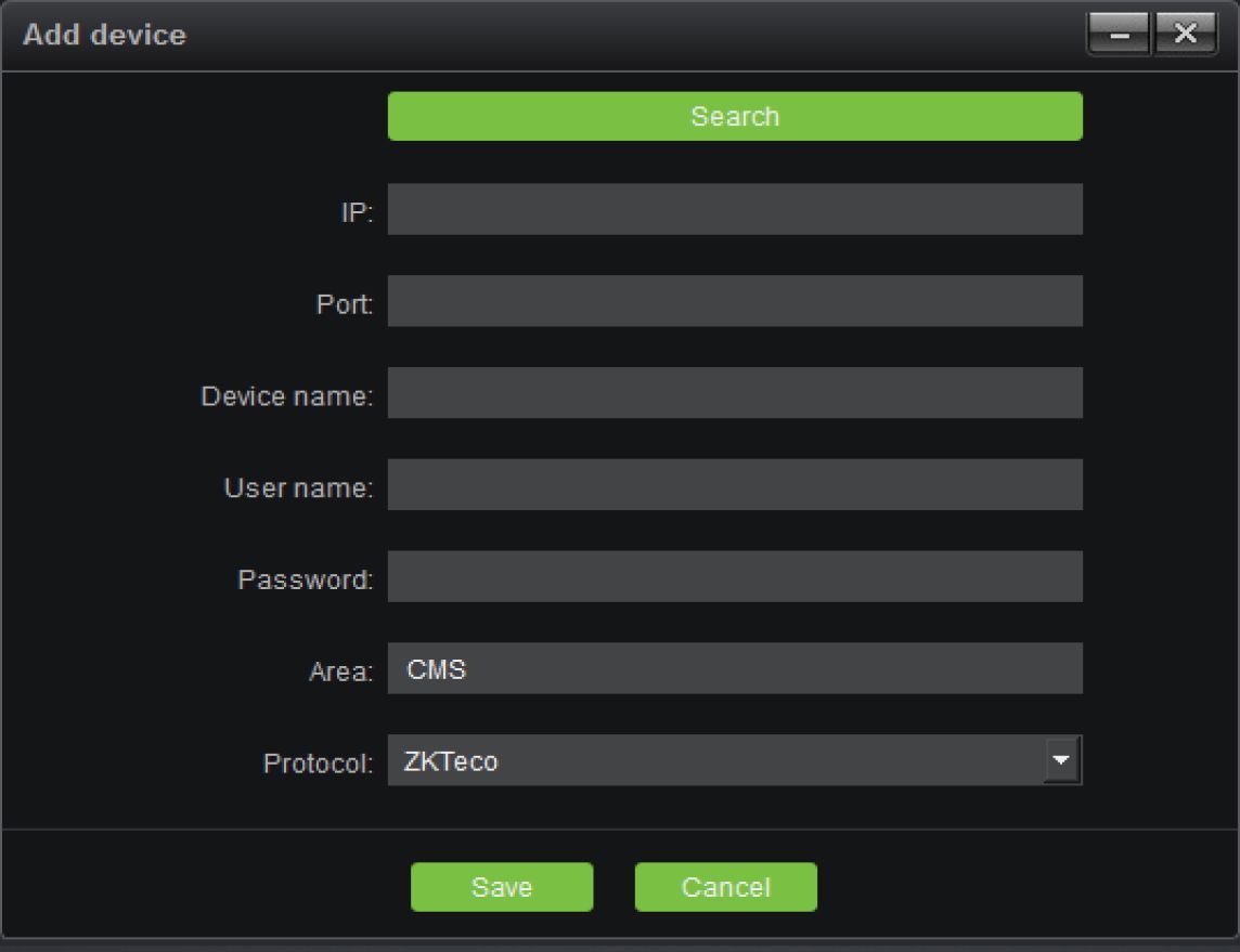Enter correct user name and password to add the corresponding device into the device list. Also, the front end using the ZKTeco protocol does not require a password. (©Note: for safety consideration,