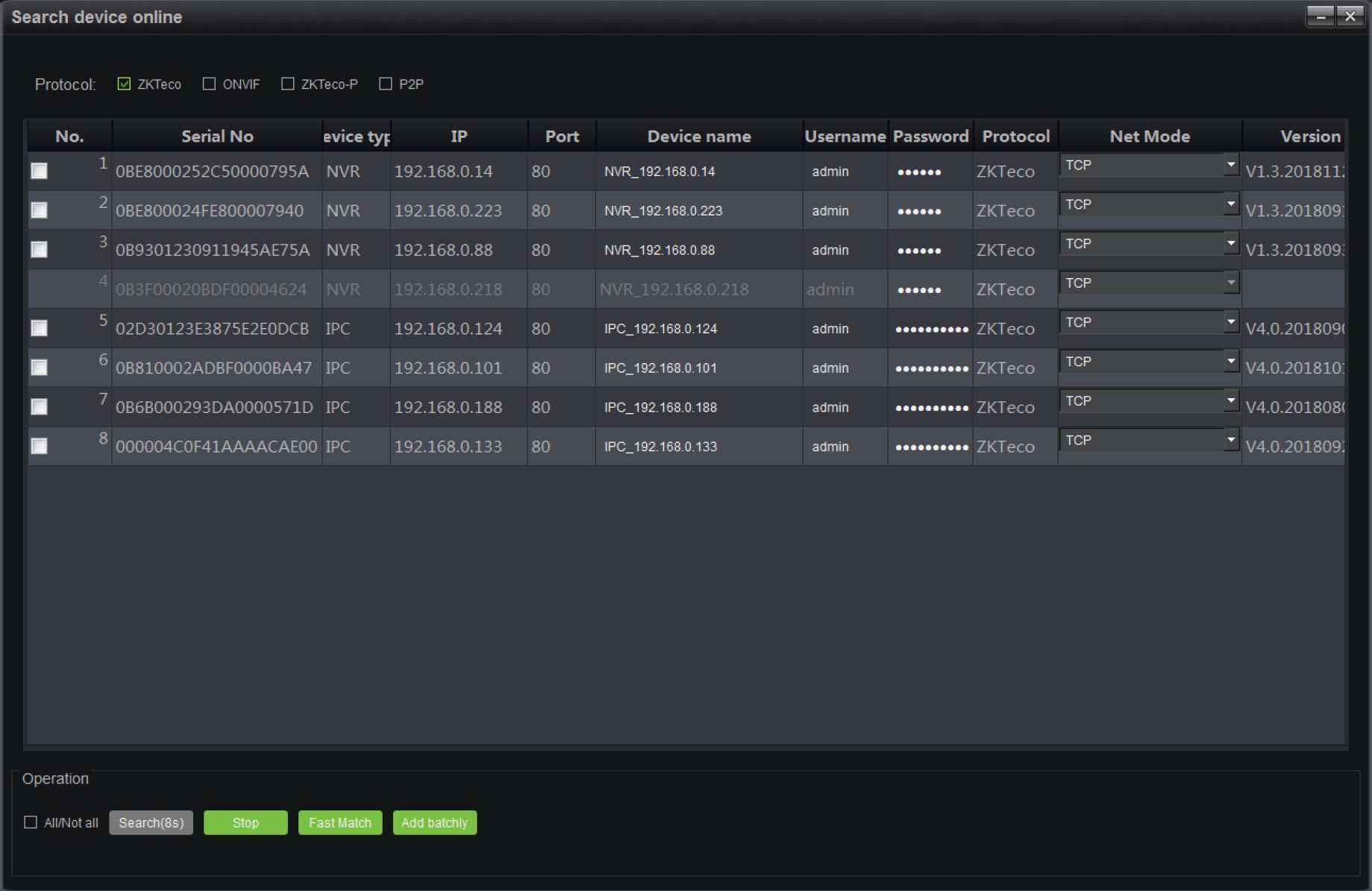 Devices using the ONVIF protocol,the password can’t be retrieved and the password of the device needs to be manually filled in; no password filled in or wrong password will lead to add log-in failure.) Fast match function means when there are multiple devices with the same username and password, choose fast match, then you just need to input the username and password for one time.