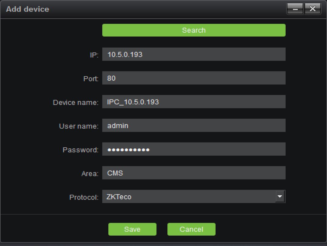 Select a protocol. ZKTeco protocol is an independently developed protocol of our company. Front-end devices should support ZKTeco protocol. ZKTeco’s front-end devices currently used for shipping basically supports this protocol. The ZKTeco-P protocol is the protocol used by PTZ domes.ONVIF protocol is the joint ownership protocol for access to third-party devices that support this protocol.