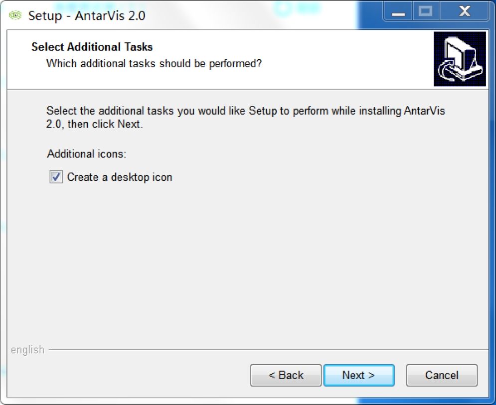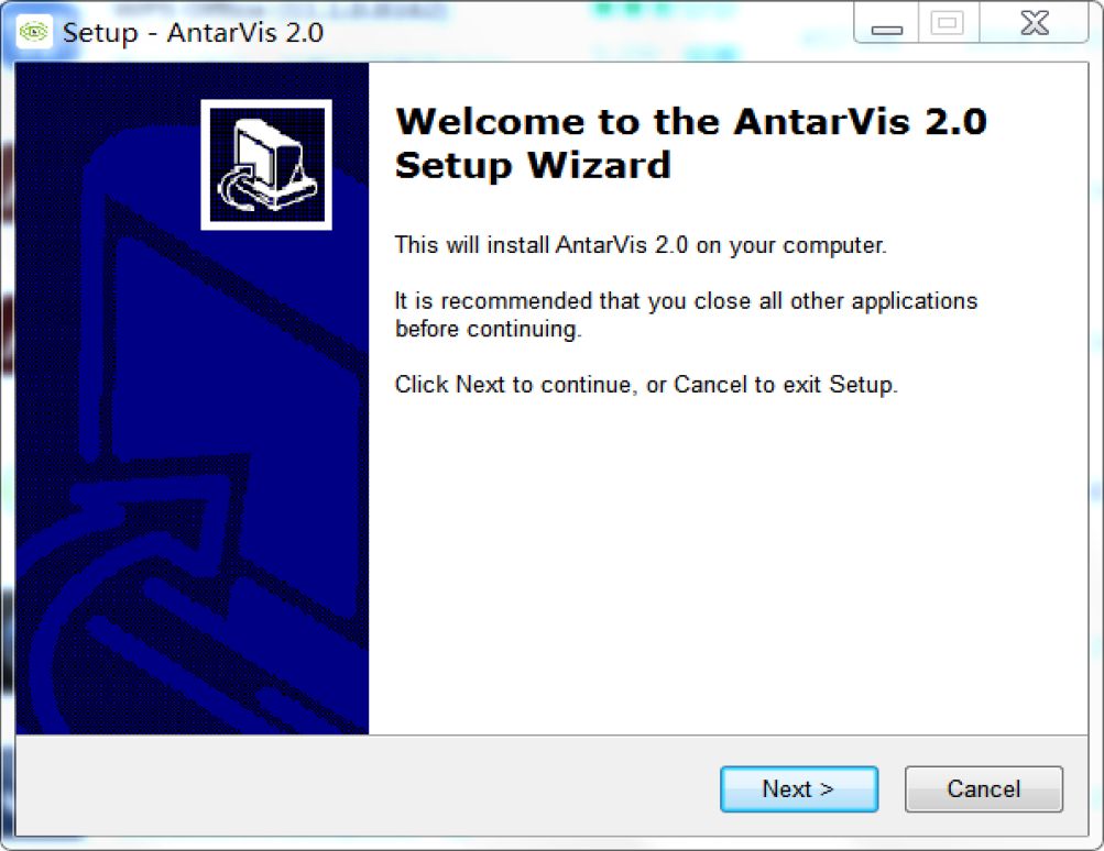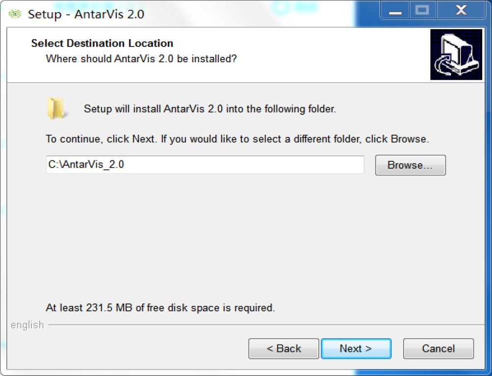System’s default path is C:\AntarVis_2.0. Users may modify the path as needed. Click on “Next” to continue: