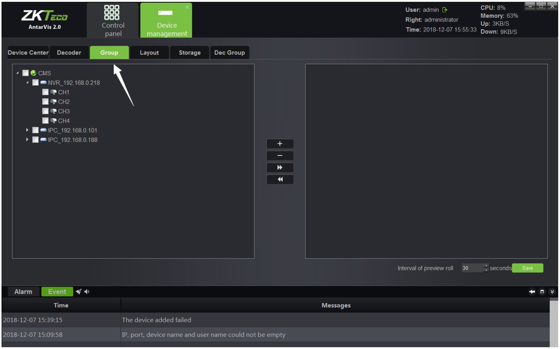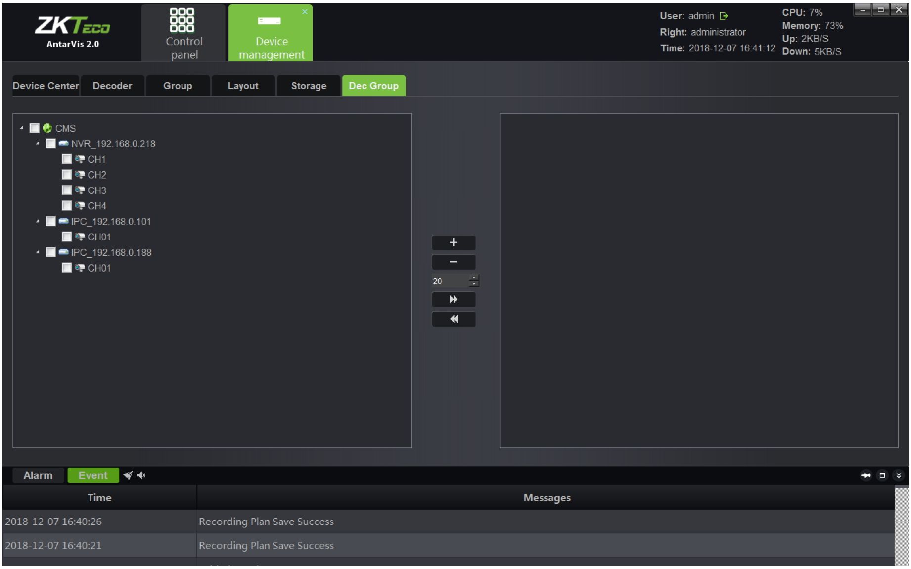 X Device Center Decoder Group Layout Storage Dec Group ‘ ■ ft CMS ■< ■ ®NVR_192.168.0.218