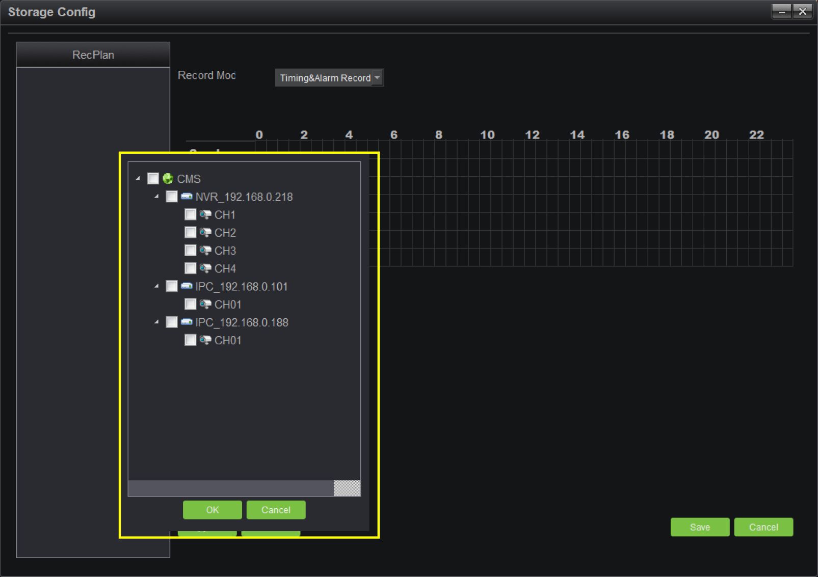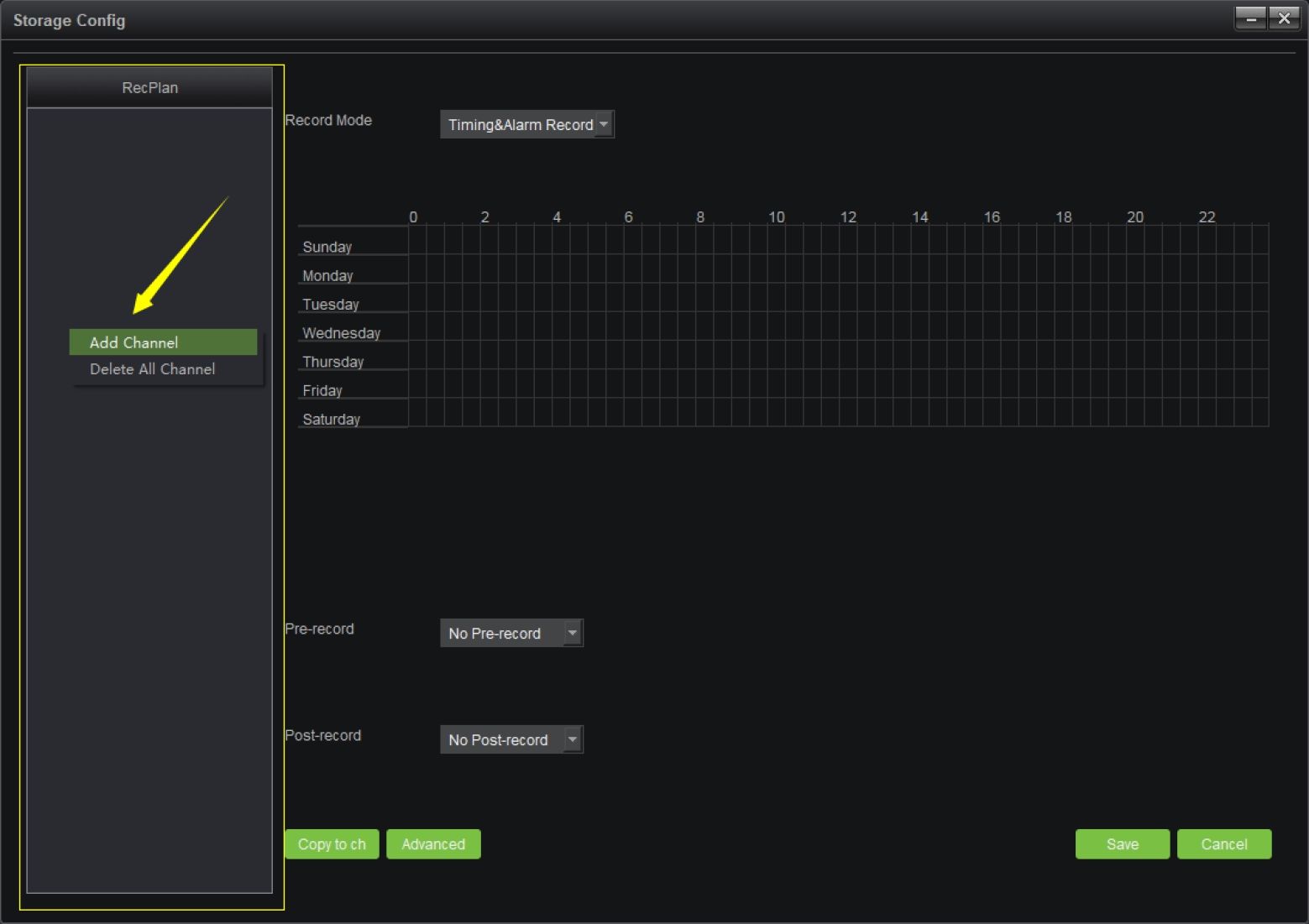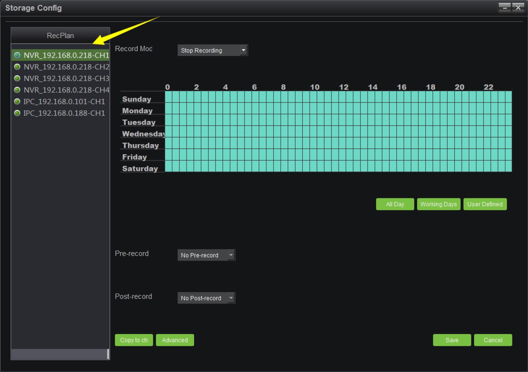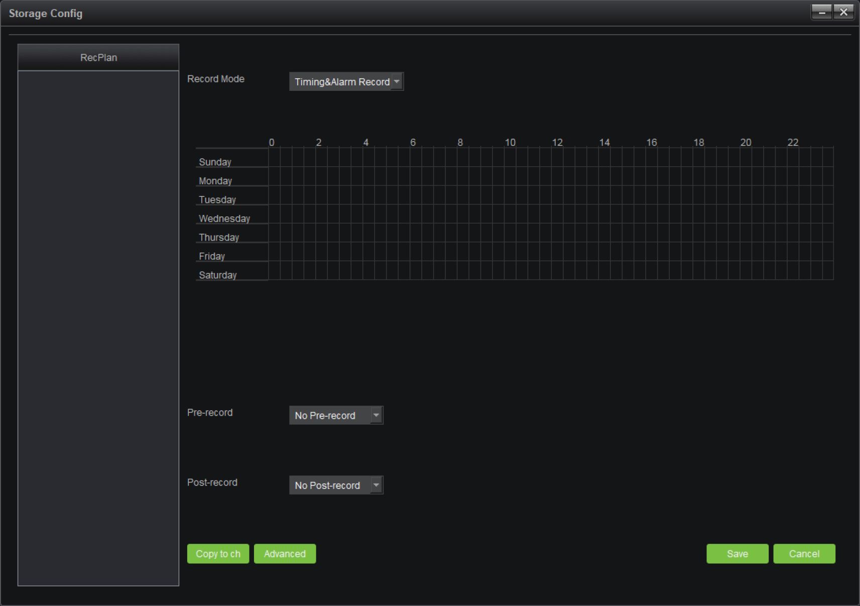 Pre-record and time delay function are only available in two modes: timing & alarm recording and alarm recording, particularly the alarm recording; copy to channel refers to copy the RecPlan of certain channel to other channel that already added to the storage server; advanced setting can set up different partitions of disk for recording while some others do not; the default setting is that other disks can be used for recording besides the system disk. Click on “Save” to make the settings effective as the configuration completed.