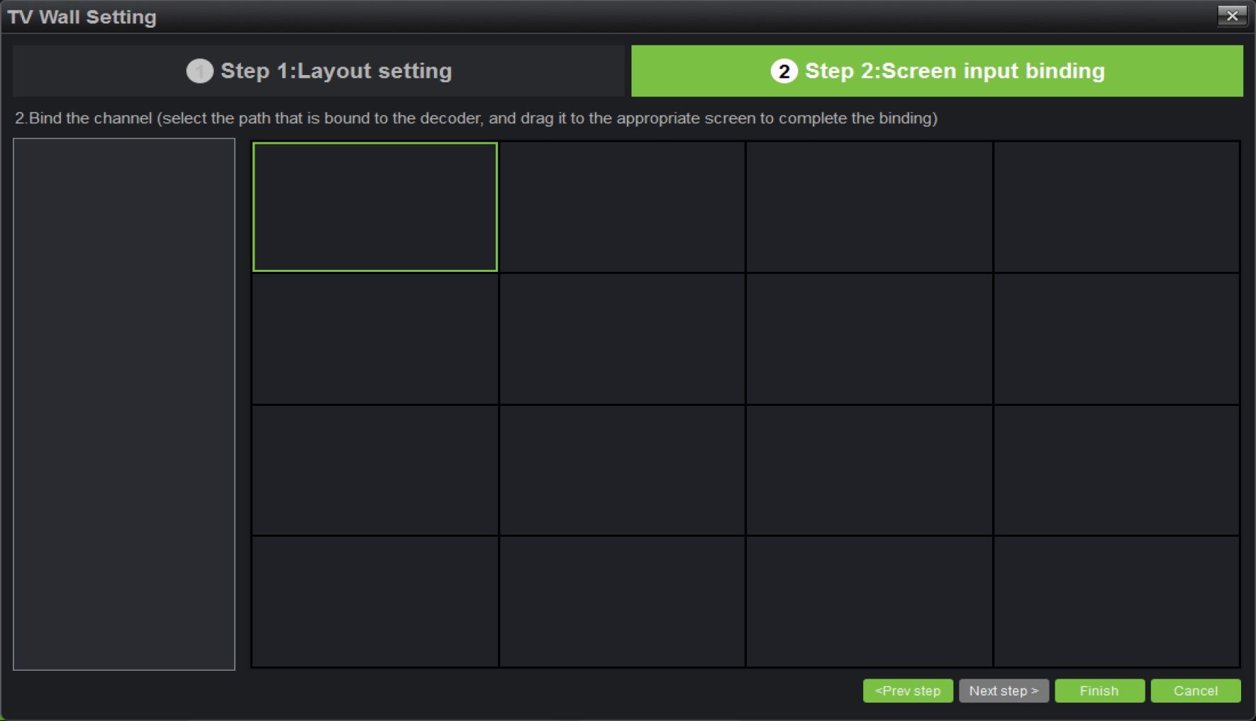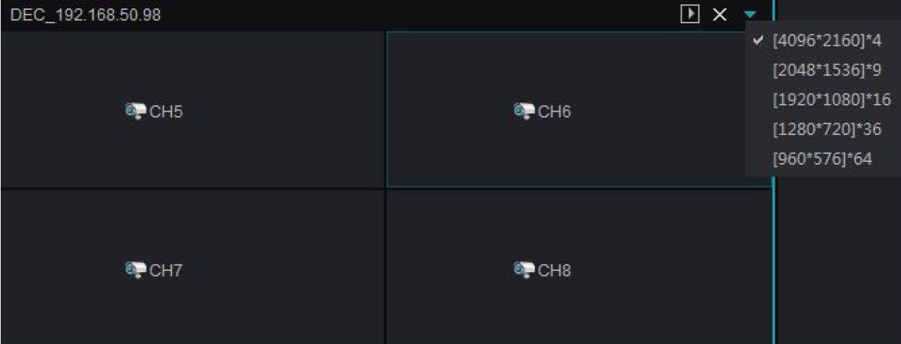 Decoding mode represents the current decoding capability of the decoder, which is listed in the figure and supports 3 decoding modes, i.e. 16 channels 720 x576, 9 channels 1280 x960 and 4 channels 2048 x1536. Please note that the subsequent number represents the maximum resolution of decoding, for example, under the 9-channel mode, the maximum resolution of decoding is 1280×960; the decoding mode of different decoders varies as well. It shall be normally decoded and displayed as the resolution of the front-end IPC has been guaranteed not to exceed the resolution restriction of the current decoder mode.